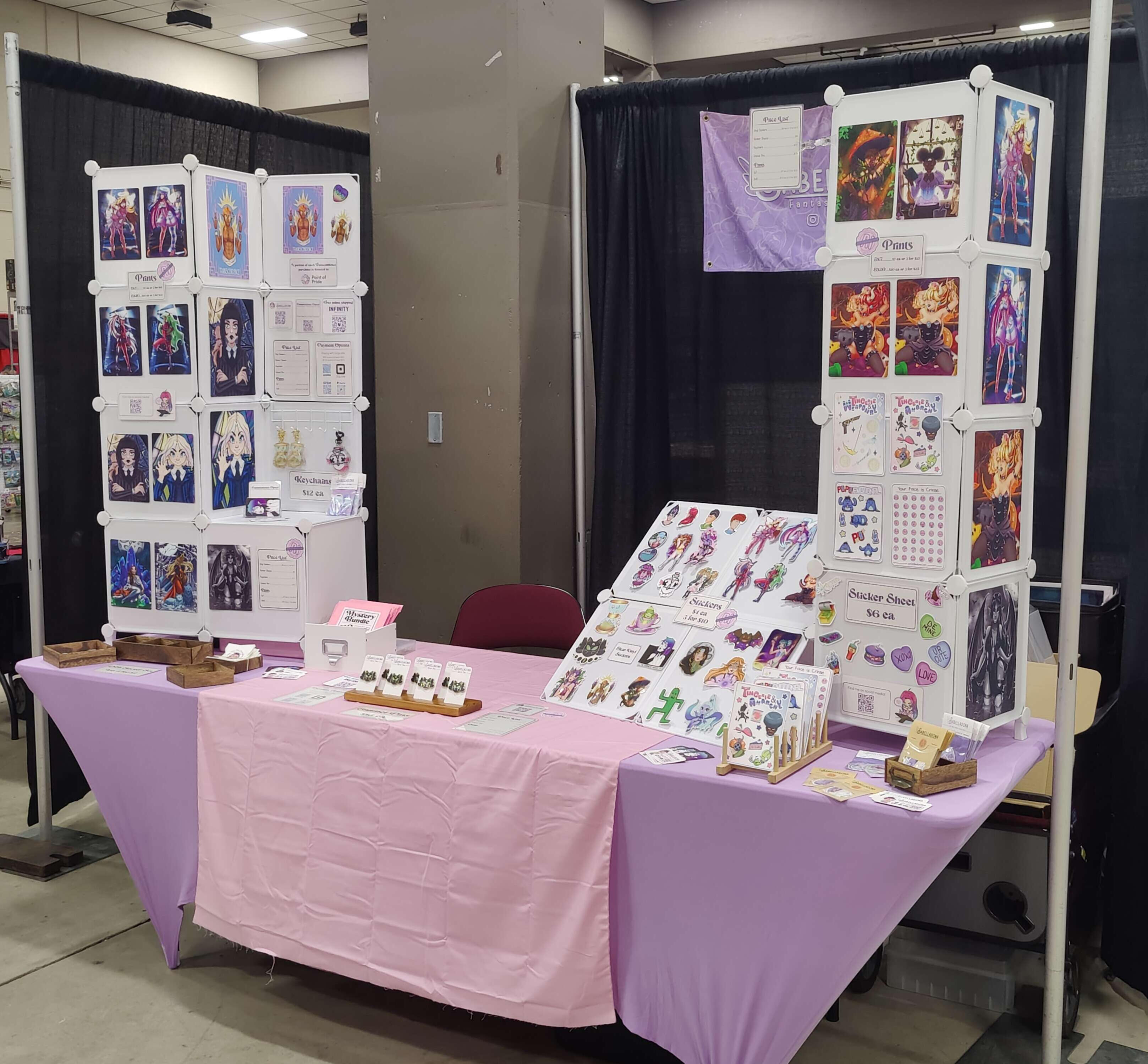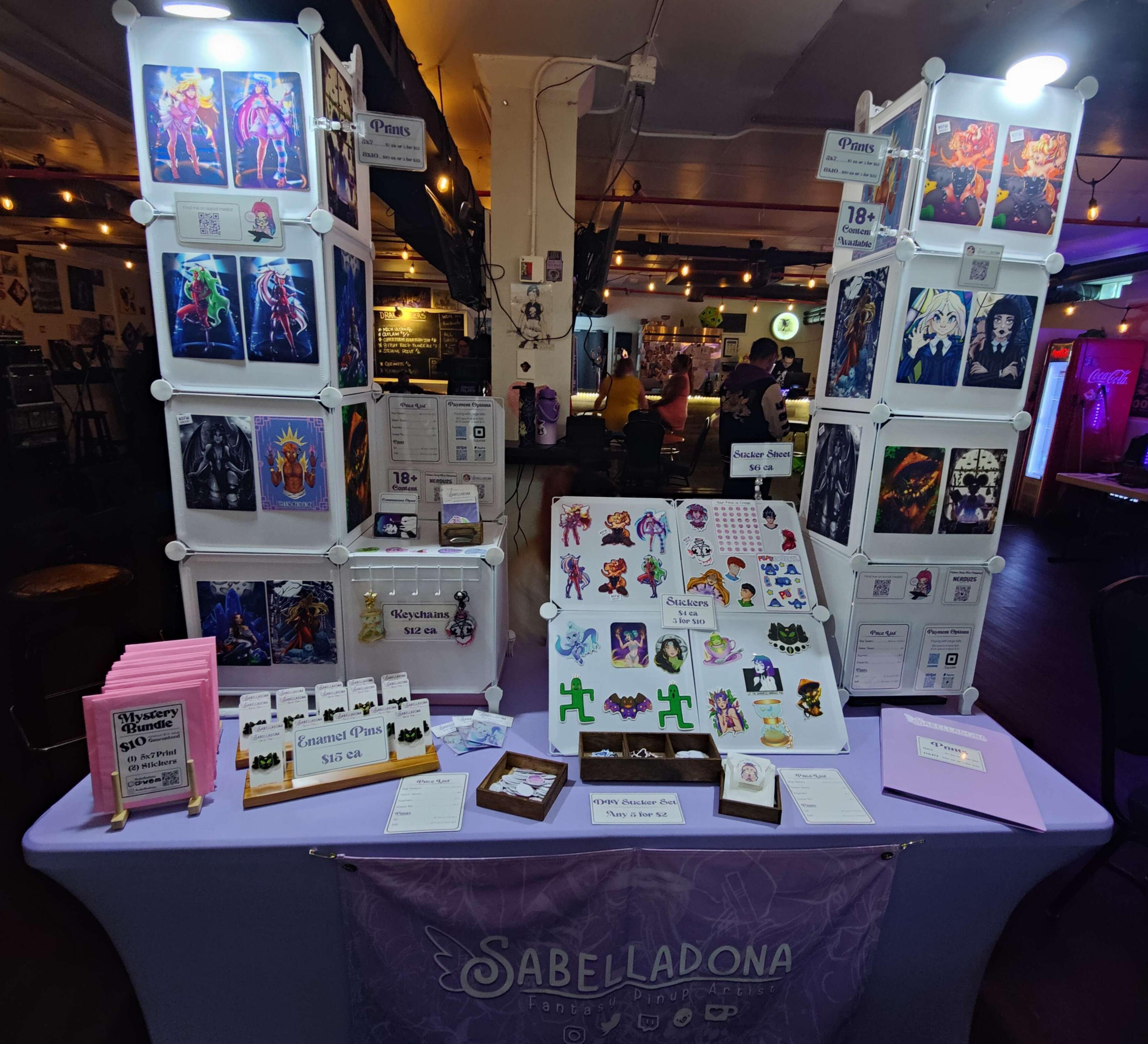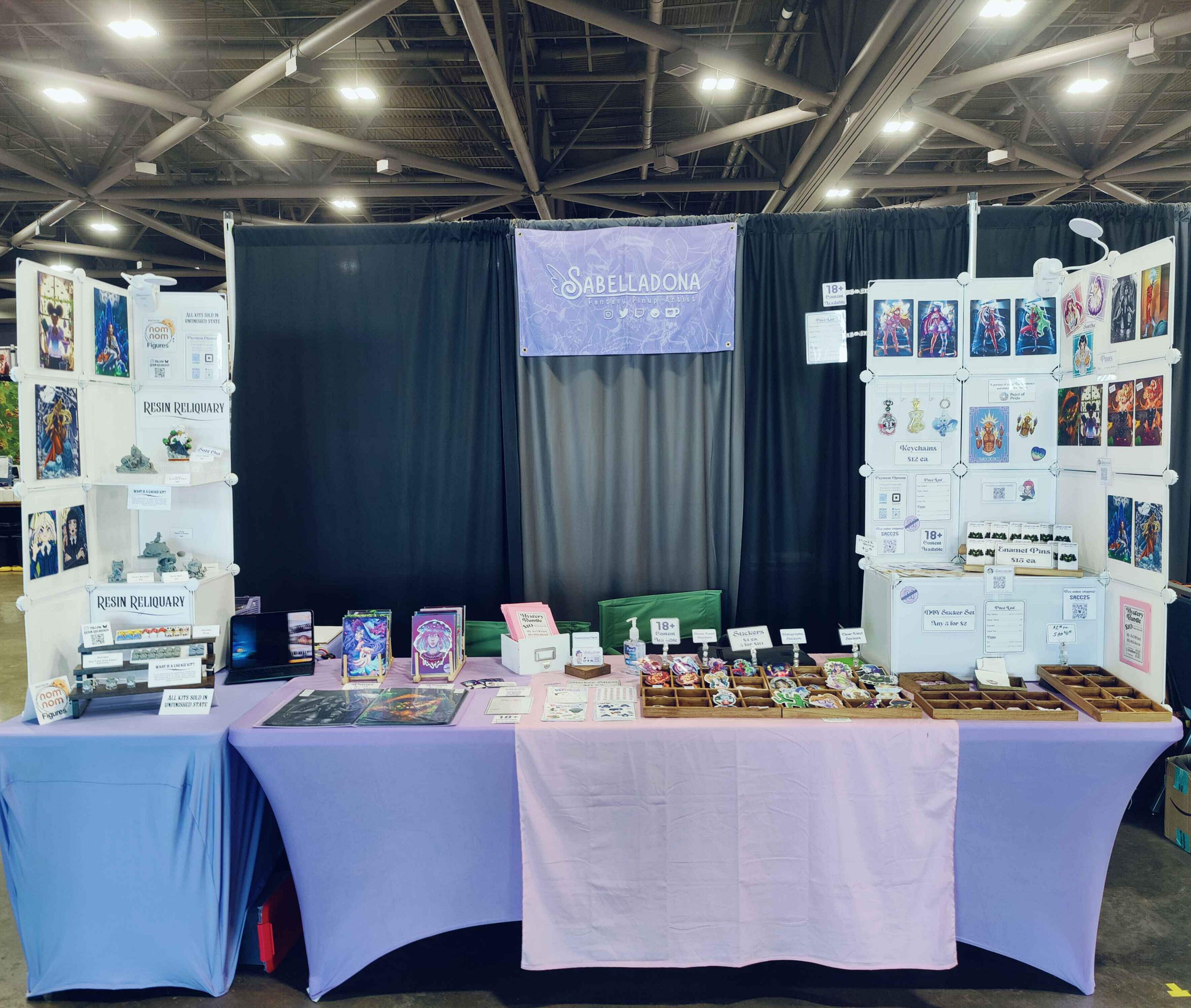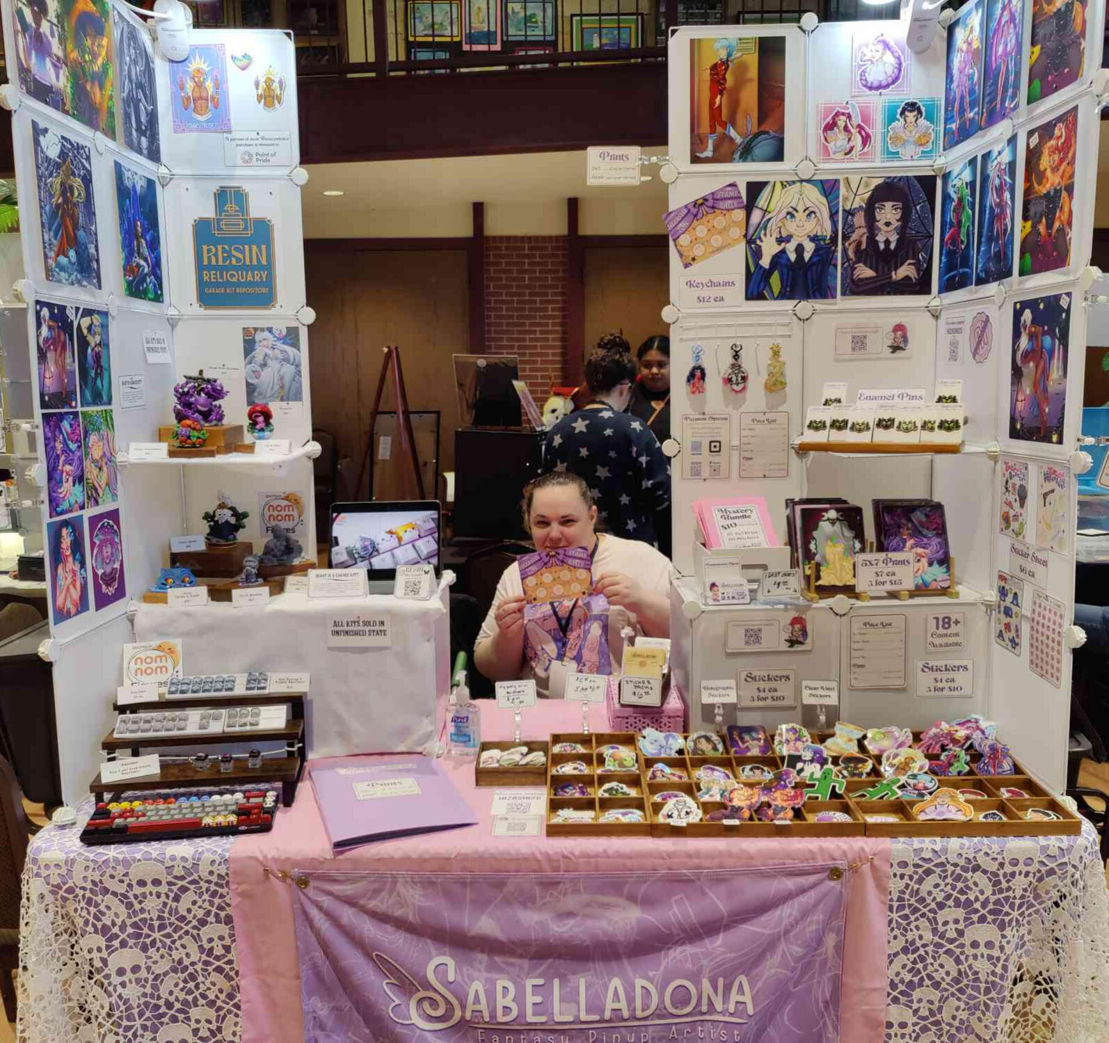 Hi! I'm Amanda and I go by the artist handle Sabelladona. I've been creating art inspired by pop culture, anime, gaming, and mythology for over a decade. I began streaming my art process on twitch.tv in 2017. My small community encouraged me to open an online shop selling my art as physical goods in 2021.In 2024 I decided I wanted to try vending at conventions and markets to meet new people and share my interests with others.In this portfolio you'll find a list of previous events I've attended (find upcoming events here), photographic examples of my booth, merchandise, and my process.If you have any further questions feel free to e-mail me. For commission or freelance work inquiries check here.